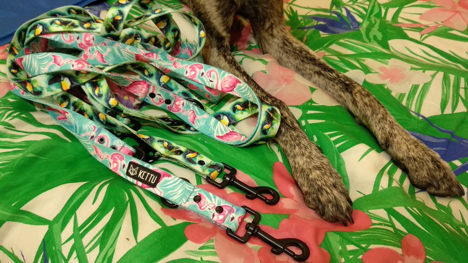Na początek garść informacji. Obie smycze są przepinane, mają długość 300 cm i szerokość 2,5 cm. Okucia są spawane, czarne, a karabinki średnie, mają długość około 7,5 cm. Nasze wzory to "Flaming" i "Tropico".